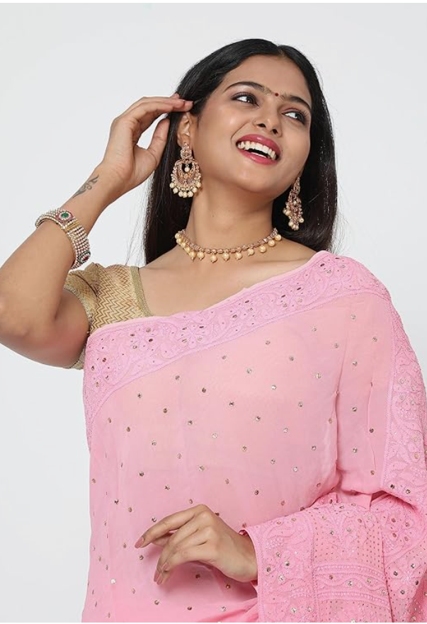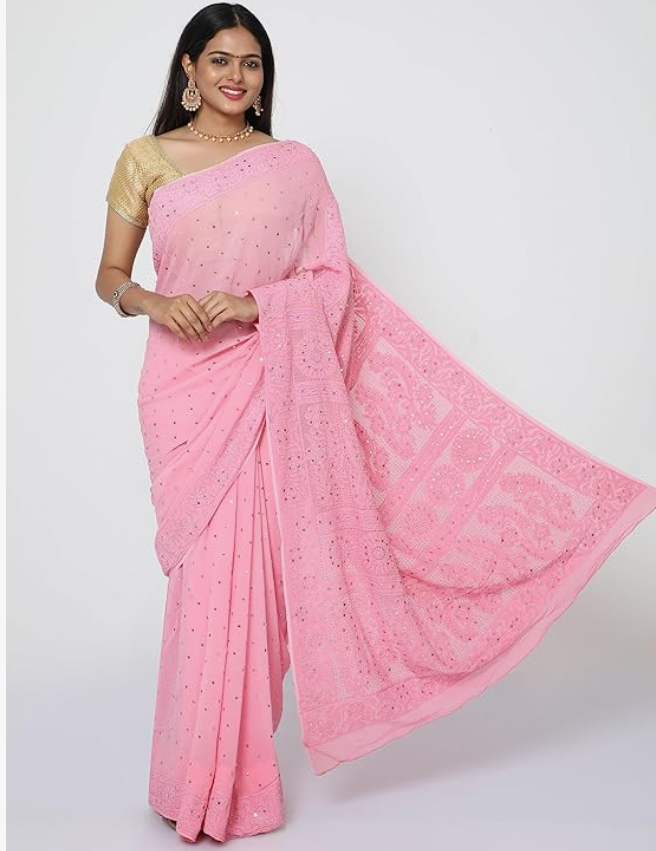 Women's Pure Georgette Lucknow Chikankari Mukaish Work Saree-6.5 Mtr(Pink)