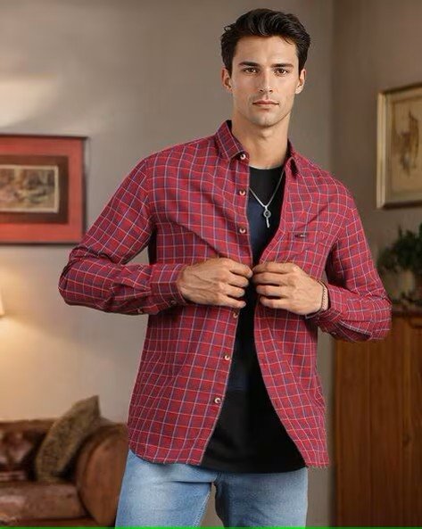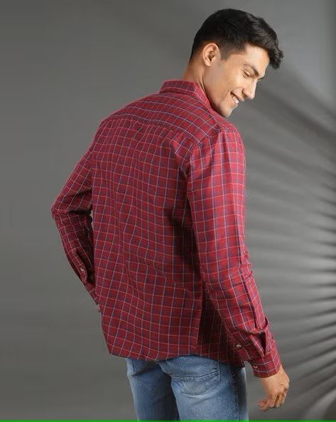Men Regular Fit Checkered Mandarin Collar Casual Shirt