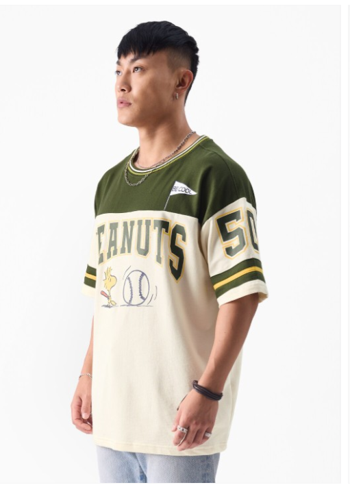 Off-White & Olive Peanuts Print Oversized Fit Pure Cotton Casual T-shirt