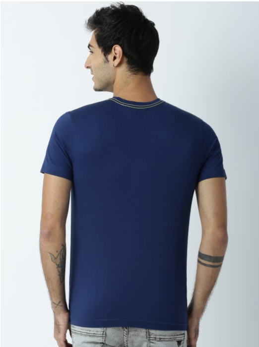 Navy blue printed T-shirt, has a round neck, short sleeves