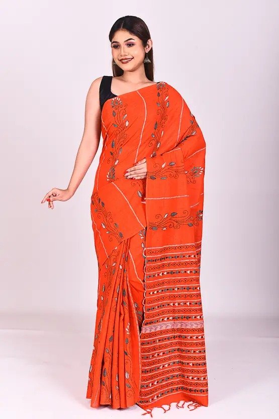 Woven Kantha Pure Cotton Saree (Orange)