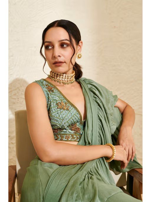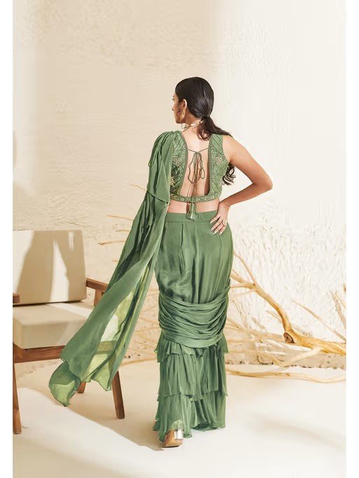 Aria Sage Green Ruffle Pre-Drape Saree with Stitched Blouse
