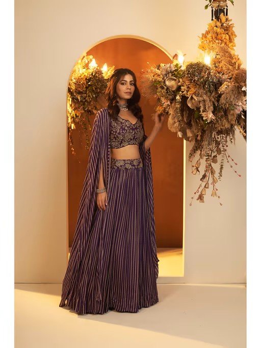 Deep Purple Bandhani Lehenga Set with Cape. The Bouse and Waist Are Fully Embroidered with Cut-Dana, Zari and Sequins.
