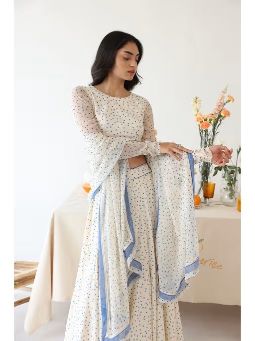 Petal off-white polka dot printed lehenga is adorned with handmade tassels on a blue and white thread braided dori, featuring elegant hand embroidery on the waist belt. Paired with a rayon moss polka dot printed blouse with chiffon printed sheer elongated sleeves and a hand-embroidered button. Complemented by a polka dot printed dupatta with a solid blue chiffon border, adorned with connecting lace and beautiful handmade flower tassels.