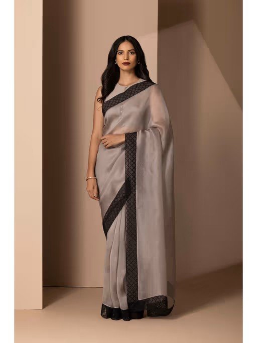 An Organza Saree Embellished with Rhinestones Detailing Along The Border and Paired with A Front Opening Blouse. Fabric : Organza (Saree and Blouse)Colour - Taupe
