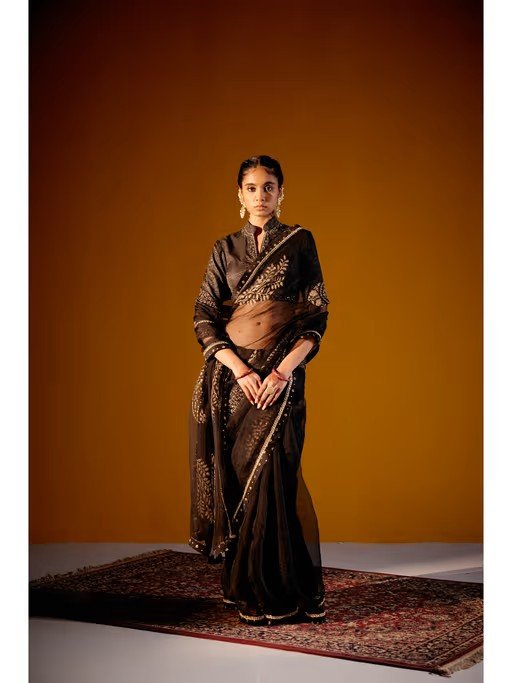 Black Organza Printed Saree And Stripe Tissue Embroidered Blouse