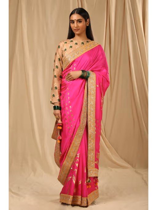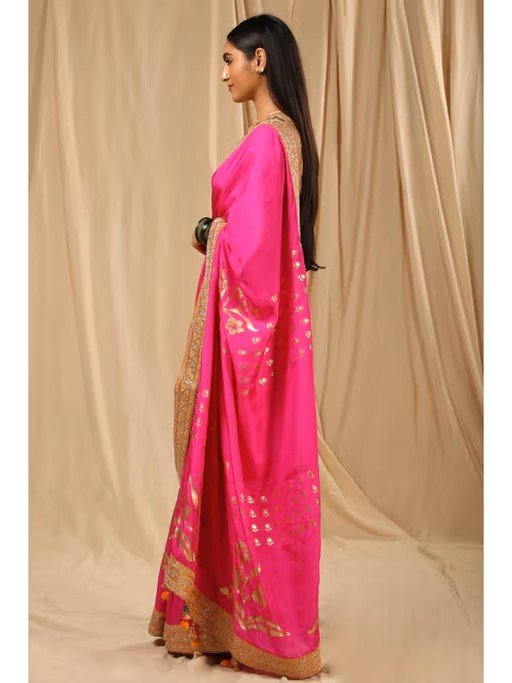 This Hot Pink Paradise Silk Saree is embellished with embroidered border and contrasting finish at the back with tassel details. It comes with Oatmeal Cotton Candy blouse piece