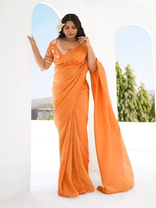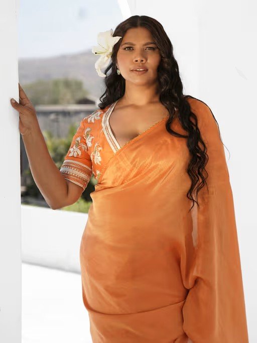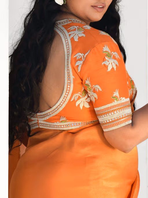 An Orange Deep Plunging Neck Blouse with Pita Work, Zardozi, and Mirror Embroidery, Paired with A Tissue Silk Saree Made Of Natural Vegan Fabric and A Thin Orange Border.