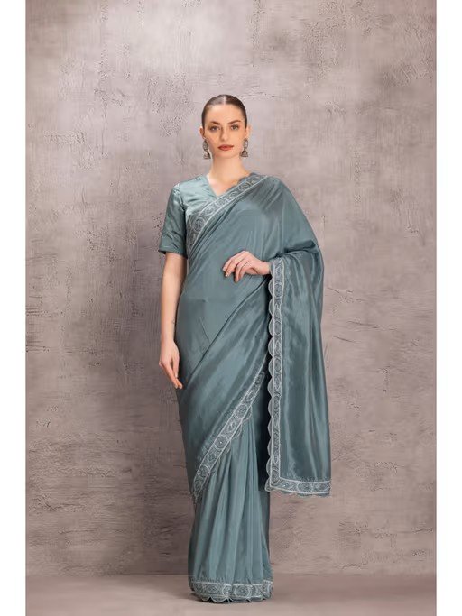 A Sky Blue Pure Silk Saree with Cutwork, Full Handwork Using Resham and Sequins Is A Stunning Choice That Exudes Elegance and Sophistication. The Sky-Blue Colour Adds A Soft and Serene Touch, While The Cutwork Detailing Enhances Its Beauty with Intricate Patterns and Designs. The Full Handwork Using Resham (Colourful Silk Threads) and Sequins Adds A Touch Of Glamour and Sparkle To The Saree, Creating A Captivating Visual Appeal A Satin Silk Blouse Full Hand Work Detailing Of Edges.