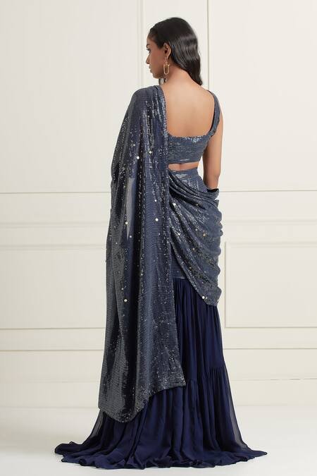 Sequin hand embroidery on saree pallu, Back deep U neck on blouse, Layered design for added volume