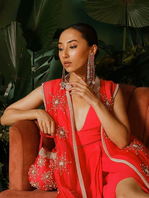 Level Up Your Look With This Red Jacket Lehenga From Midushi Bajoria. Crafted From Cotton, It Is Finished With A Sleeveless Design And A Mandarin Neck. Complete The Look With A Pair Of Heels And Statement Jewellery.