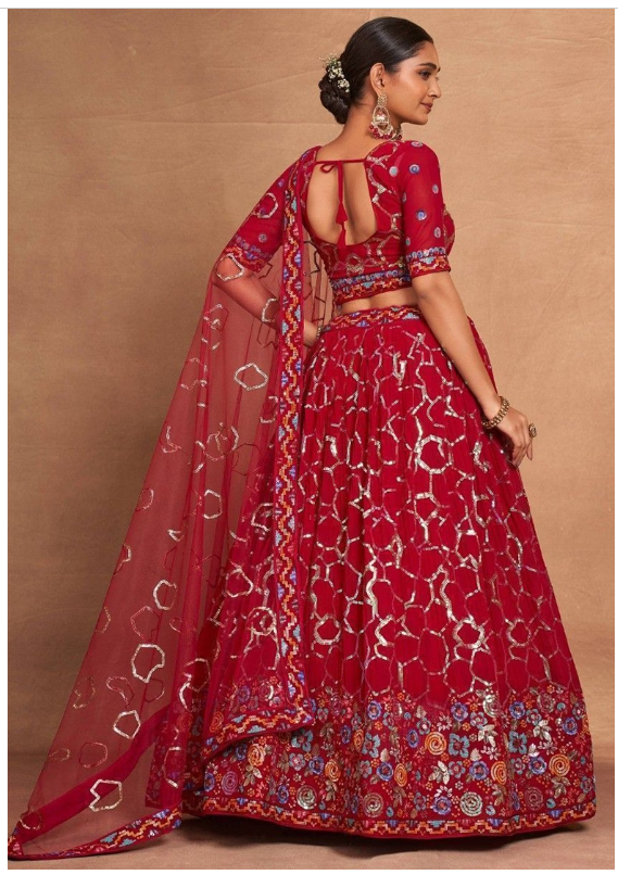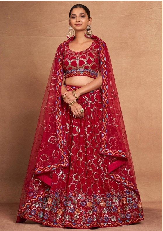 Red Sequin Embroidered Georgette Lehenga Set 28100