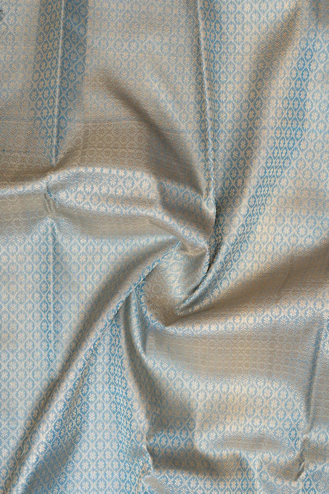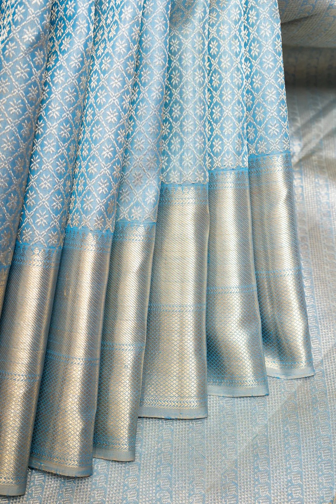 This exquisite Sapphire blue Zari Brocade Pure Kanchipuram Silk Saree provides a sophisticated, timeless flair. Intricately woven zari motifs adorn the saree, coupled with a self border for a majestic, lavish feel. Complete the look with classic jewellery for a remarkable ensemble.
