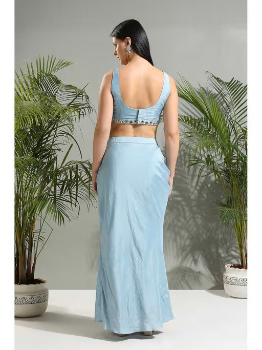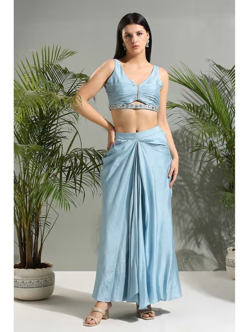 Floral Printed Satin Silk Jacket With Mirror And Pearl Embroidery, Paired With Grey Draped Skirt And Cropped Blouse