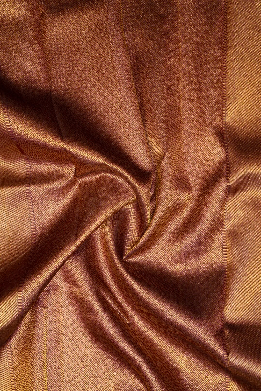 Mulberry Purple Pure Kanchipuram Silk Saree features stylish zari checks and a turning border, making it a timelessly elegant addition to any wardrobe. The traditional silk material ensures durability and long-lasting quality. Elevate your look by pairing this saree with traditional jewellery.