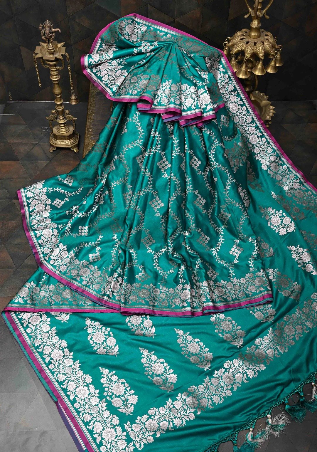 This saree is ready to wear with fall and pico done. Tassels adorn the pallu and add more grace to it. An unstitched blouse fabric is included.
