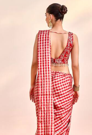 Red saree featuring an all-over checkered print. Paired with a sleeveless blouse adorned with floral prints and intricate cutdana, sequin, and zardozi embroidery.