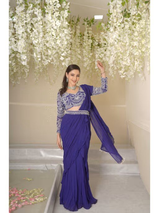 Scallop Pearl Hand Embroidered Blouse. Full Sleeves, Back Opening . Drape Saree With Side Zip. Embroidered Belt.