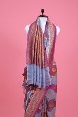 Step into elegance with this grey georgette khaddi silk handwoven saree. The saree showcases a delicate gold zari woven floral jaal with intricate rangkat motifs and creates a mesmerizing appeal. The contrast gold zari ethnic woven border and pallu adds a traditional touch. Accompanied by a matching unstitched blouse piece, this ensemble is a perfect blend of sophistication and ethnic charm, making it an ideal choice for special occasions.