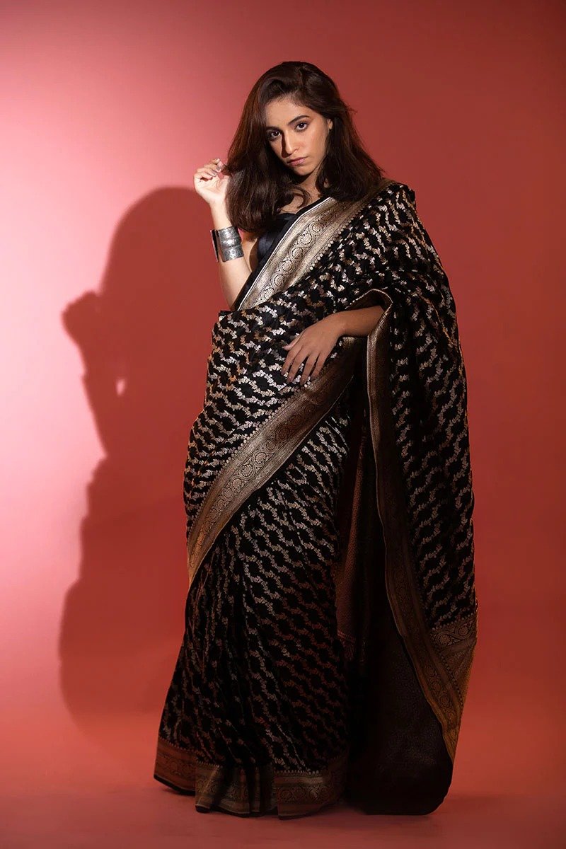 Meticulously woven from pure silk threads, this saree exudes timeless grace and opulence. Its intricate patterns and rich texture add a touch of regal charm, perfect for special occasions and celebrations. The watergold and silver zari woven slanting stripes all over the saree with watergold zari ethnic woven border and pallu is worth a mention. Made of quality katan silk fabric, this one offers a smooth drape making it a statement piece in your collection.
