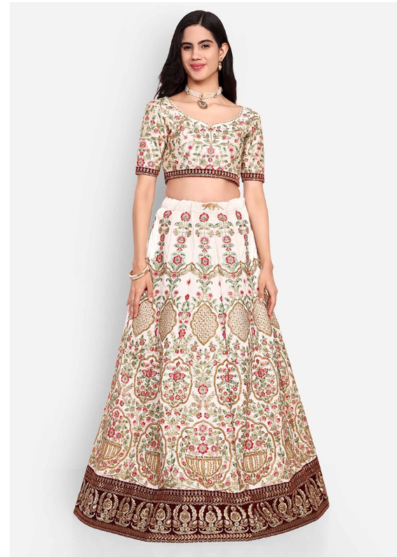 Make a graceful statement in this Off White Thread Sequin Embroidered Art Silk Lehenga Set, featuring intricate embroidery on luxurious silk. Ideal for special occasions, this elegant ensemble combines timeless design with rich texture for a truly regal look.