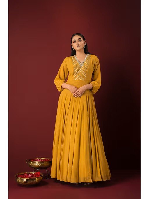 Floor Length Anarkali Dress With Drop Shoulder And Ballon Sleeve Yoke Embroidery With Mirror And Pastel Colour Resham