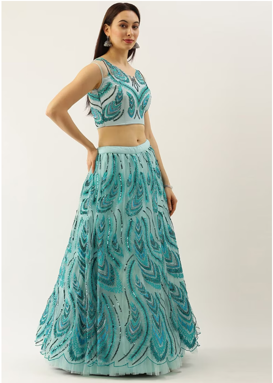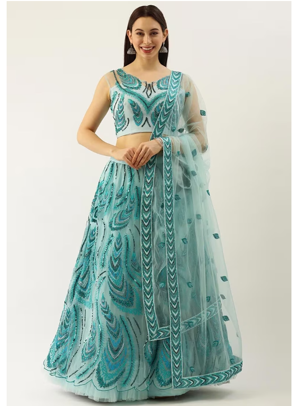 Step into elegance with this stunning Sky Blue Thread Embroidered Net Lehenga Set, designed to turn heads at every celebration. A beautiful blend of tradition and trend, it's your perfect pick for any grand event.