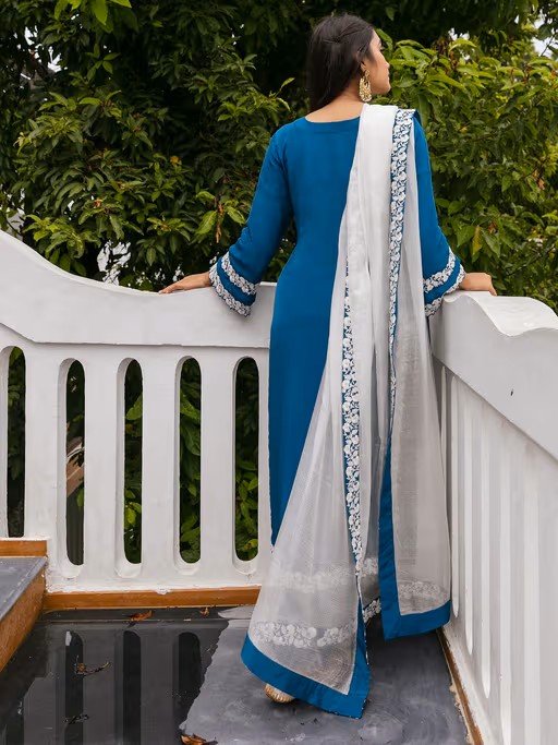 Teal blue crepe kurta embellished with resham work paired with pants and kota dupatta.