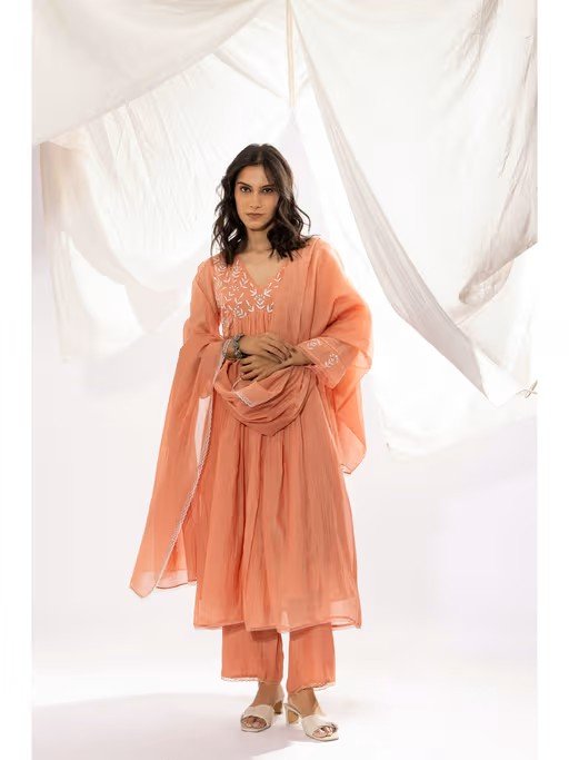 3P Set Includes Chanderi Mull Embroidered Chikan Kurta , Cotton Silk Bottom And Organza Dupatta.Peach Chanderi Mull Kurta With Chikan Embroidery On Front And Sleeves .It Has Slight Gatthers At Front. Peach Cotton Silk Bottom With Silk Organza Scallop Border At Hem. Straight Fit Bottoms With Front Belt And Elastic At Back . Peach Polka Dot Printed Chanderi Mull Dupatta With Lace All Around