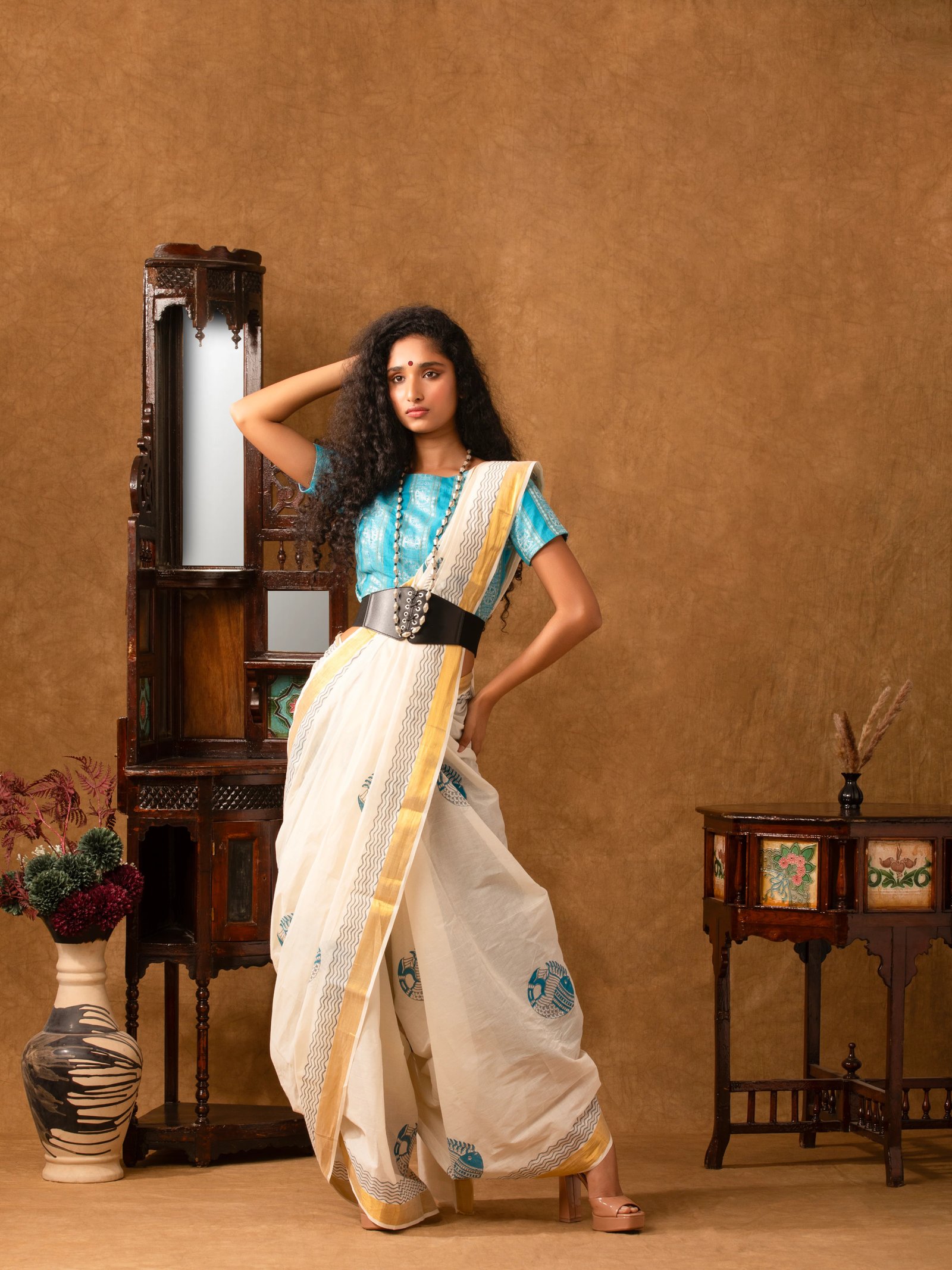 Elevate your style with our White Kasavu Fish Motif Zari Border Jugalbandhi Saree Meen. Made from pure cotton Kasavu from Balaramapuram, this offwhite saree features a golden tone zari border and quirky fish motifs block printed along the body and pallu. A contemporary twist on the classic Onam saree, this is sure to make you stand out in any crowd. Embrace luxury and exclusivity with this elegant saree.