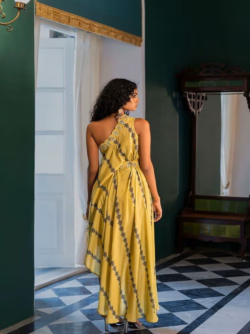 Yellow Evil Eye Print One Shoulder Evil Eye Asymmetric Cut Dress(Half Side Belt Show) with Evil Eye Belt