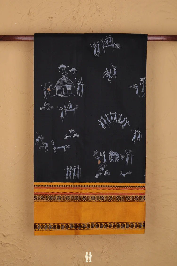 Exquisite kanchipuram silk saree in a striking black hue, adorned with intricate Warli tribal art motifs. This handcrafted masterpiece combines the luxurious texture of traditional kanchipuram silk with contemporary design elements, creating a sophisticated statement piece for discerning connoisseurs of fine textiles. Perfect for elegant occasions that demand both cultural significance and refined aesthetics.