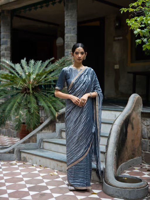 Grey Hand Embroidered Metallic Saree with Stitched Blouse