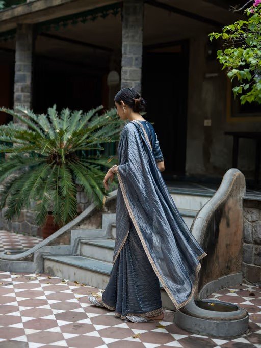 Grey metallic saree hand embroidered in border paired with embroidered metallic blouse