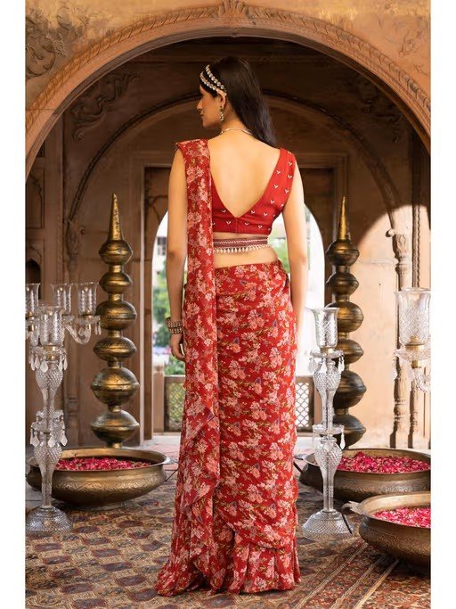 Red Floral Printed Saree with Stitched Blouse and Belt (Set of 3)
