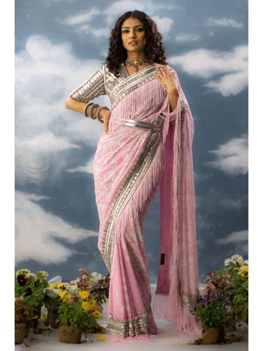Lilac Pink Printed & Embroidered Saree in Chiffon -Handcrafted in Chiffon -Handpainted motifs printed on a chiffon -Hand embroidered border in metallic silver and adorned with fringes -Comes with unstitched unembroidered matching solid blue blouse piece in chanderi with hand embroidred border -The Blouse in the picture is for styling purpose only and can be purchased only.