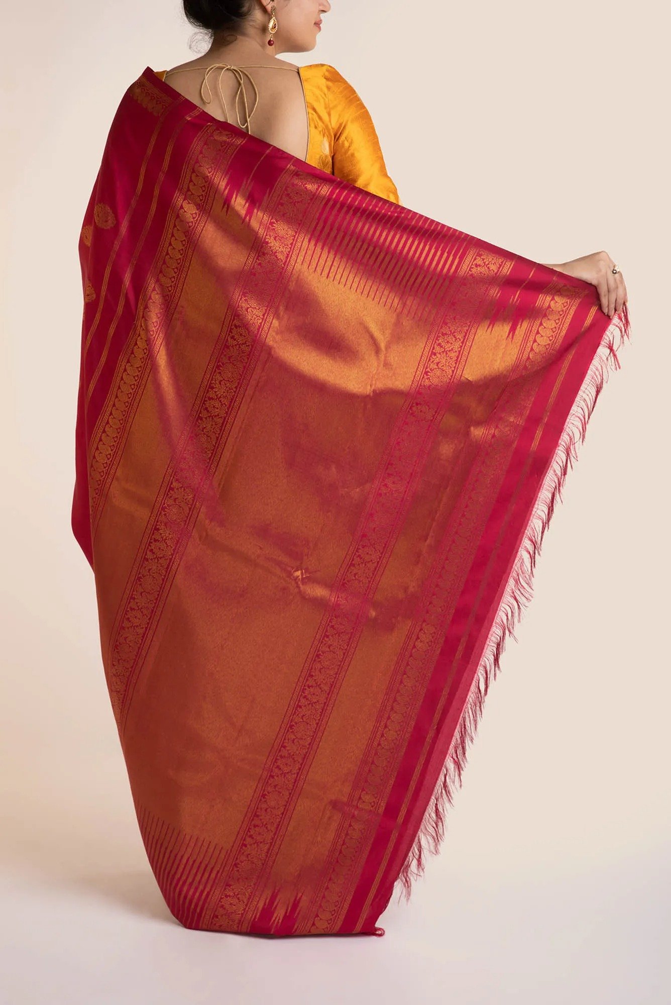 Our 'Gandaberunda' design Kanchipuram silk saree takes about 165 handloom weaving hours to make. Handcrafted in four-ply yarn for a fine drape, and in pure silk to suit auspicious occasions, the saree is an ode to the two-headed bird Narasimha. Gandaberunda patterns adorn the body while the border is adorned with kalash, peacocks, and manga motifs. The blouse worn by the model is not included.