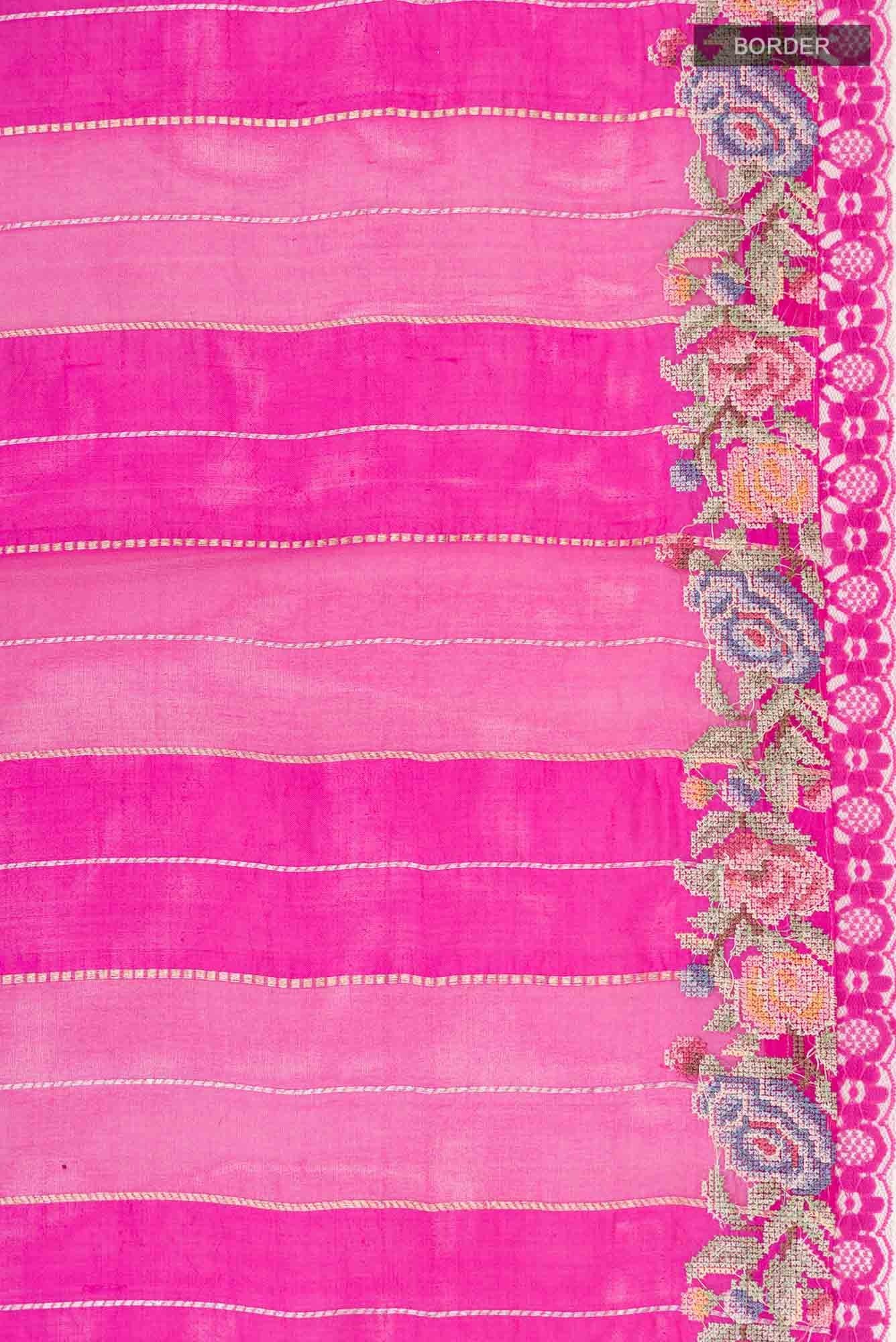 Pink Organza Silk Saree with Zari Butta on the body and Embroidery Border. Includes unstitched blouse.