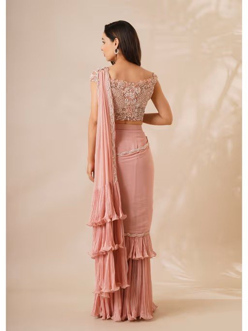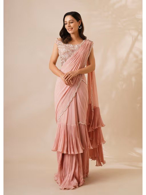 This limelight-stealing georgette pre-draped saree with sequins detailing featuring a ruffled silhouette, complementing the look with an embroidered blouse in sequins, cutdana and pearl detailing.
