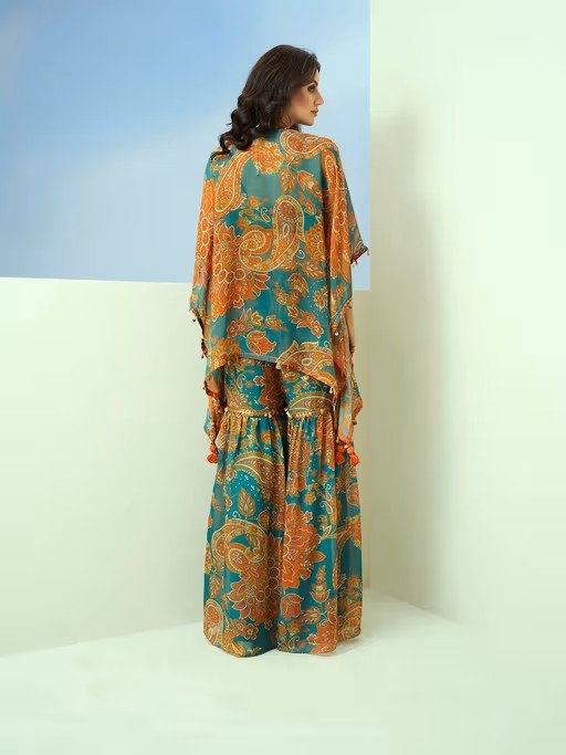 Blue Printed Organza Kaftan Sharara Pant Bustier