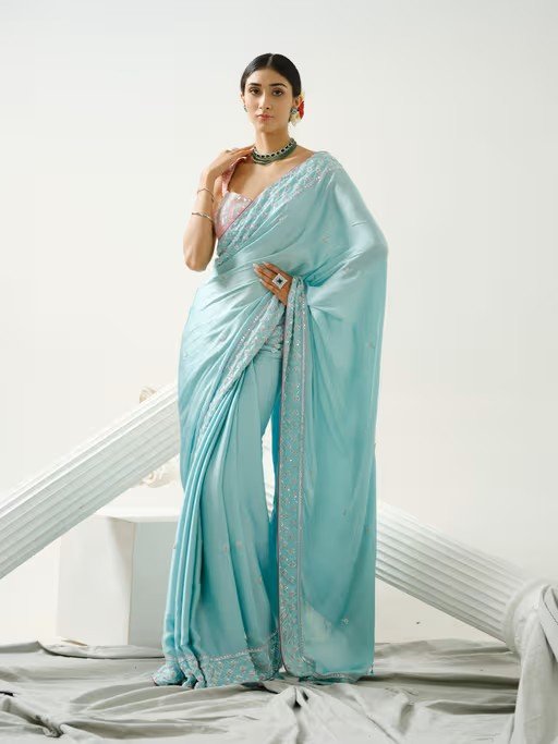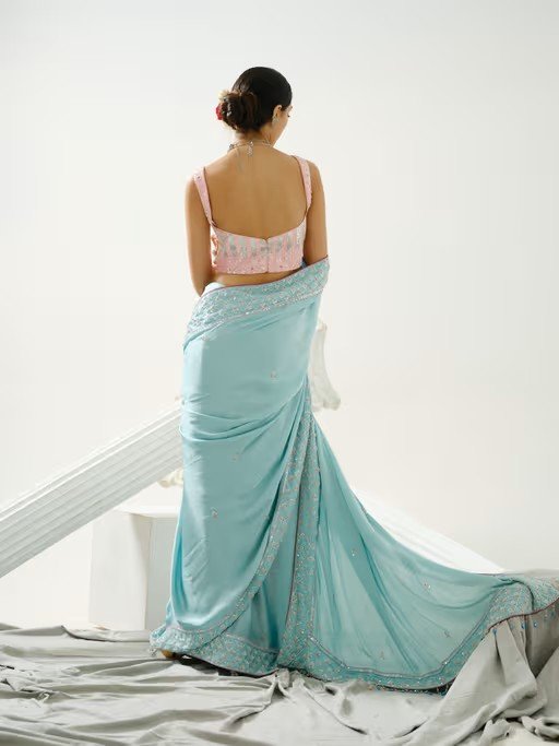 Ocean Blue Sequin Saree with Border Work Paired with Shaded Sequin Pink Blouse