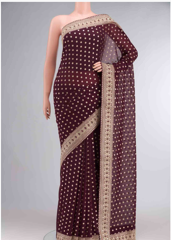 Maroon Georgette Saree with Embroidery on the body and Embroidery Border. Includes unstitched blouse.