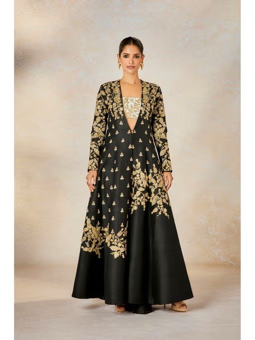 "The Raat Rani Jacket, A Fusion Outfit That Blends Traditional Artistry with Contemporary Style. This Captivating Ensemble Features An Ankle Length Blazer, Richly Embroidered with Zardozi, Moti Work, Reflecting The Opulence Of Indian Craftsmanship. The Blazer Is Adorned with Enchanting Motifs Like The 'berry Bel', Symbolizing Grace and Natural Beauty, Making This Piece Truly One-Of-A-Kind. The Ensemble Is Completed with A Draped Skirt, with A Drape Detail That Adds A Modern Flair To The Traditional Silhouette. It Is Paired with A White Bustier Adorned with 'berry Bel' Motifs. The Raat Rani Jacket Is Perfect for Those Who Seek To Make A Statement with Timeless Elegance and A Touch Of Whimsy, Ideal for Weddings, Festive Occasions, or Any Event Where You Wish To Stand Out with Grace and Charm