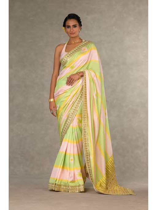 Saree - Leheriya inspired digital printed saree | Palla embroidered with signature Anar and Trikone borders in dori, sitara and moti kaam Blouse piece- Parijat printed blouse piece with embellished borders