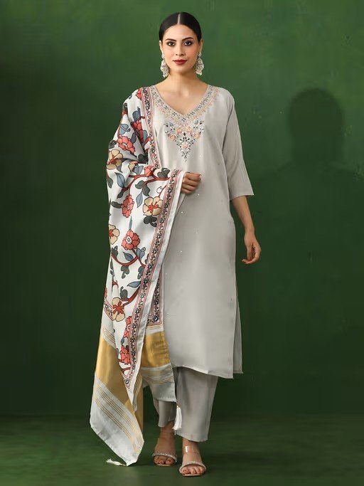 Embrace a comforting style with this Floral Chanderi Silk Off White Kurta Set. This A-Line Kurta For Women has a V-Neck, Three-Quarter Sleeves With thread work. Paired With a Pant.