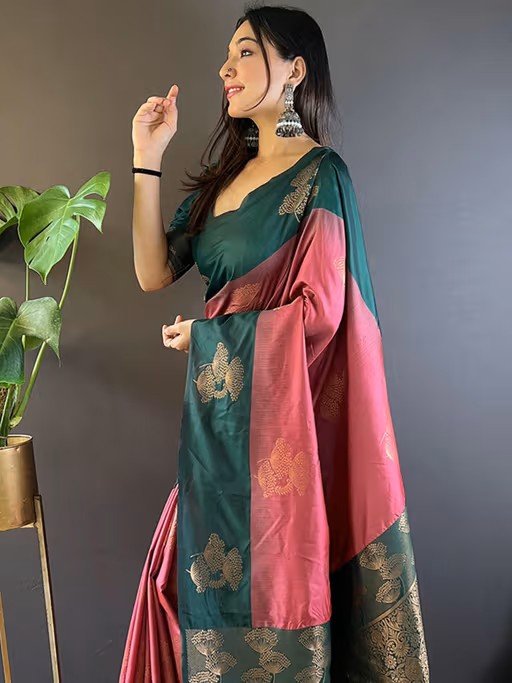 Peach Women Kanjivaram Soft Silk Saree with Unstitched Blouse