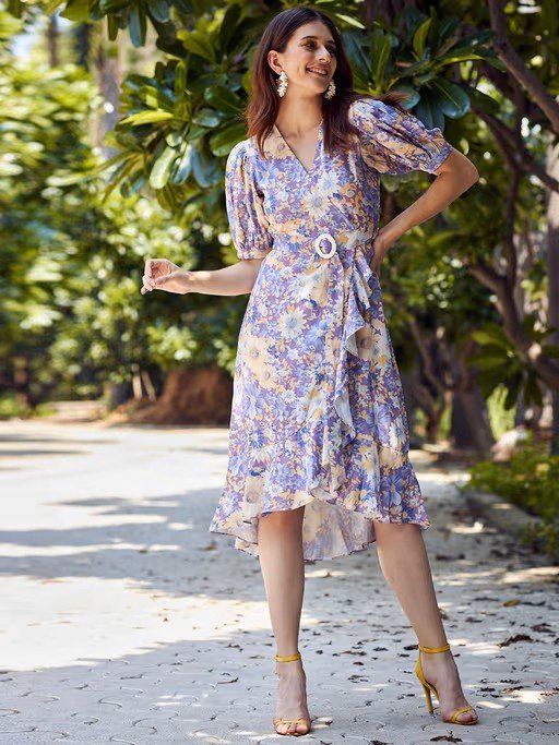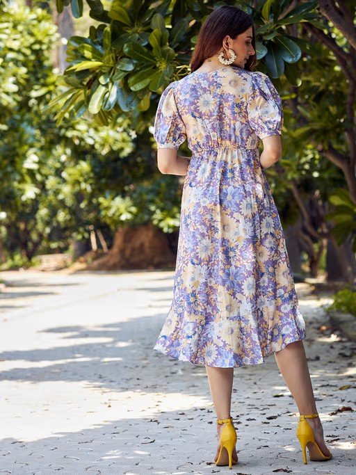 Be The Centre Of Attention With This Captivating Lavender Yellow Floral Crepe Dress From Athena. Made From High-Quality Polyester, This Piece Features Half Sleeves And A V-Neck. Style It With Minimal Jewellery And Sandals To Complete The Ensemble.
