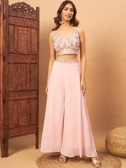 Women Pink Embellished Crop Top with Palazzo and Jacket