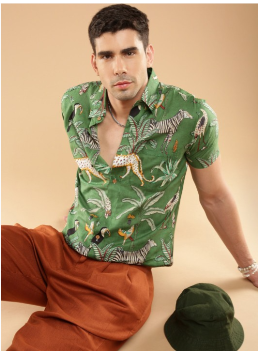 Green and yellow jungle-printed regular-fit casual shirt ,has a spread collar, button placket, 1 patch pocket, short sleeves, curved hem