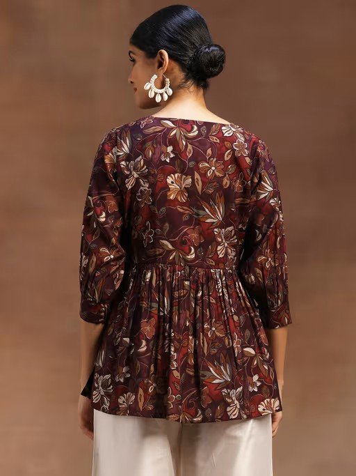 Keep it ethnic and stylish with this burgundy kurti from Libas. Made from high quality silk blend, it features pull on closure and floral pattern along with three fourth sleeves & v-neck design. Pair it with ethnic footwear with bottoms of your choice to complete your ensemble.